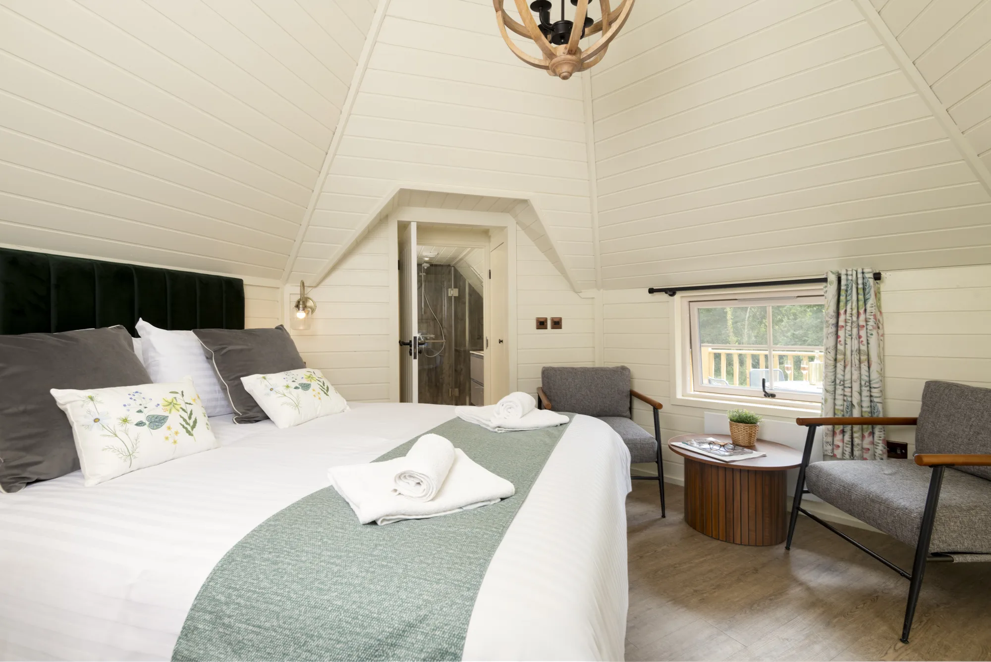 In a quiet woodland clearing, your one-bedroom Woodland Retreat is a romantic hideaway. Step from the porch into the stunning hexagonal living area which reaches high into a central apex, lending a feeling of space to the room. This is your bedroom and living space, with a sumptuous king size bed and a comfy seating area. A luxury bathroom and fully equipped kitchen make up this cosy bolthole, and when you want to enjoy the woodland sights and sounds, relax into the outdoor copper bath and soak up the outdoor life. Out here on the decking, there’s also a seating area where you can relax with the sights and sounds of nature all around you.