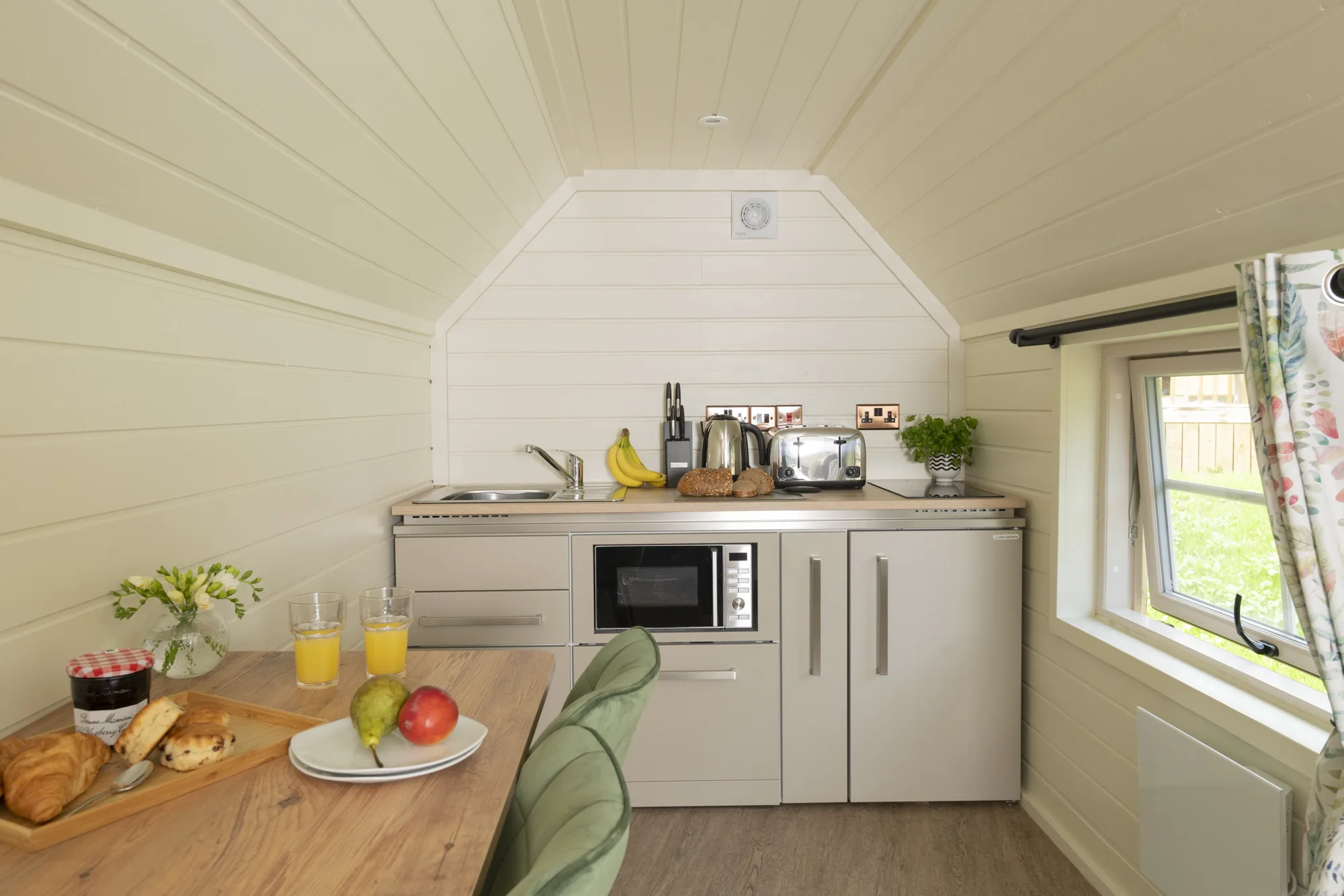 • Separate, fully equipped kitchen with a fridge with ice box, a two ring hob, and a combi microwave oven & grill